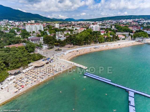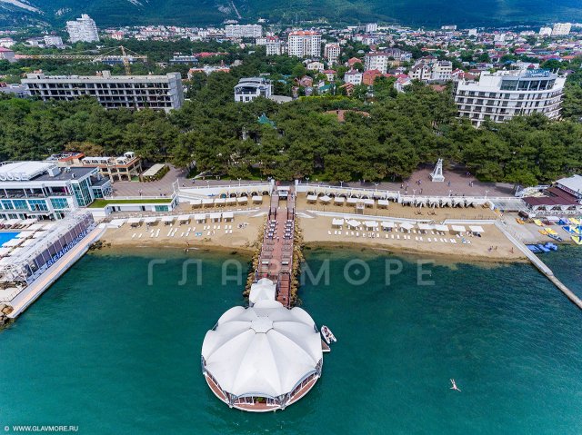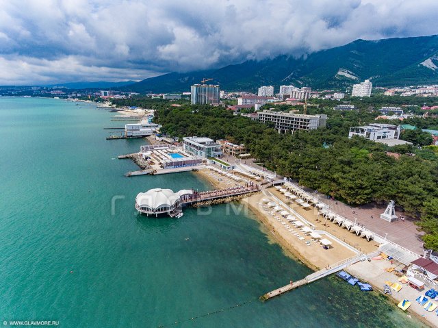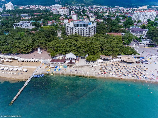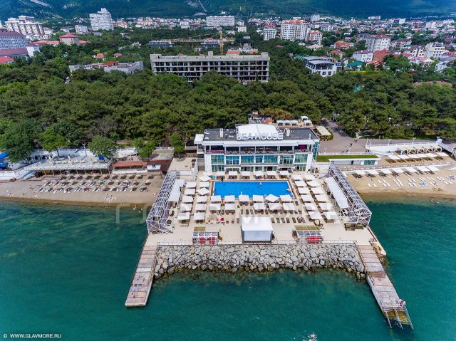Пляж отеля (панcионата) Приморье расположен на Лермонтовском бульваре рядом с музыкальным фонтаном на набережной и аркой, между ул. Садовая и Морская. Протяженность пляжа около 300 метров. Пляж состоит из нескольких участков - галечного, песчаного и с искусственным покрытием. Имеются открытые (свободные для посещения) зоны и закрытые, доступные по карте гостя Приморье или платно. От пляжа в море уходит плавучий понтон с лестницами для спуска в воду. Имеется специальная зона "Sea House" с рестораном, открытым бассейном, шезлонгами и обслуживанием - вход платный. Белый шатер установленный на пирсе - один из ресторанов отеля.